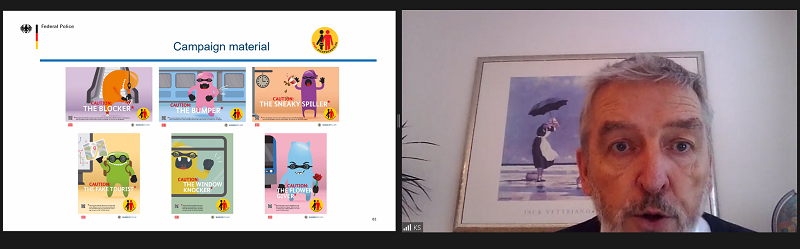 Helmut Langenbach from the German Federal Police displayed their international prevention campaign against pickpockets, launched during UEFA 2021 and disseminated in various railway environments. By explaining the common ways in which pickpockets operate, the general public who had received the communication expressed a higher awareness of the issue and a higher willingness to report to the police.