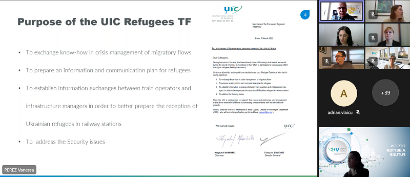 Mr Guigon gave an overview of the morning’s meeting and the situation today, with over two million people having fled Ukraine to countries in Europe such as Poland, Slovakia, Hungary and Romania, among others. He reminded the meeting that the Task Force aims to exchange know-how between UIC members on the management of migration flows, prepare communications plans for the refugees, establish information exchanges between train operators and infrastructure managers to better receive Ukrainian refugees in railway stations, as well as address security issues. A LinkedIn group has been created on the UIC page to share and discuss any issues relating to this initiative.