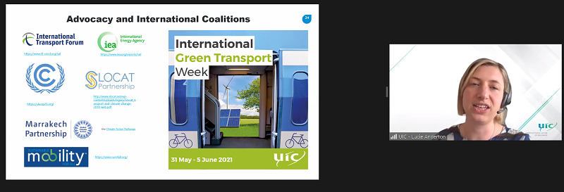 The webinar programme consisted of three dedicated panels. Moderated by Thierry Béra, UIC CFO and Africa Region Coordinator, the first panel began with a presentation by Lucie Anderton, UIC Sustainable Development Unit Manager, on the initiatives and projects developed by UIC. Ms Anderton talked about the International Green Transport Week to be held from 30 May to 5 June, as well as key projects on the circular economy, sustainable land use, air quality, energy efficiency and carbon, and noise and vibration, as well as the flagship SDG Rail Index project.