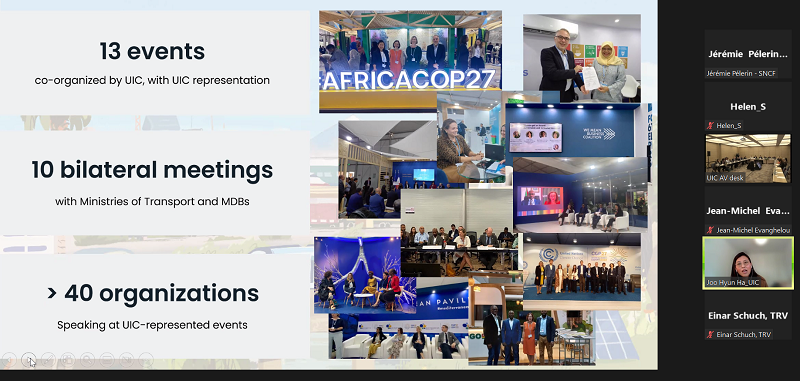 Regarding Sustainability, Joo Hyun Ha, UIC Senior Sustainability Advisor, on behalf of Lucie Anderton, Head of Sustainable Development, gave a return on experience of COP27, held last November in Egypt, and the preparation for COP28 planned later this year in Dubai. COP27 was an excellent opportunity for UIC to come into contact with over 40 organisations and exchange with other areas beyond the rail community, thus helping to elevate the role of railways in the transport community as a solution for sustainable mobility in the future.
