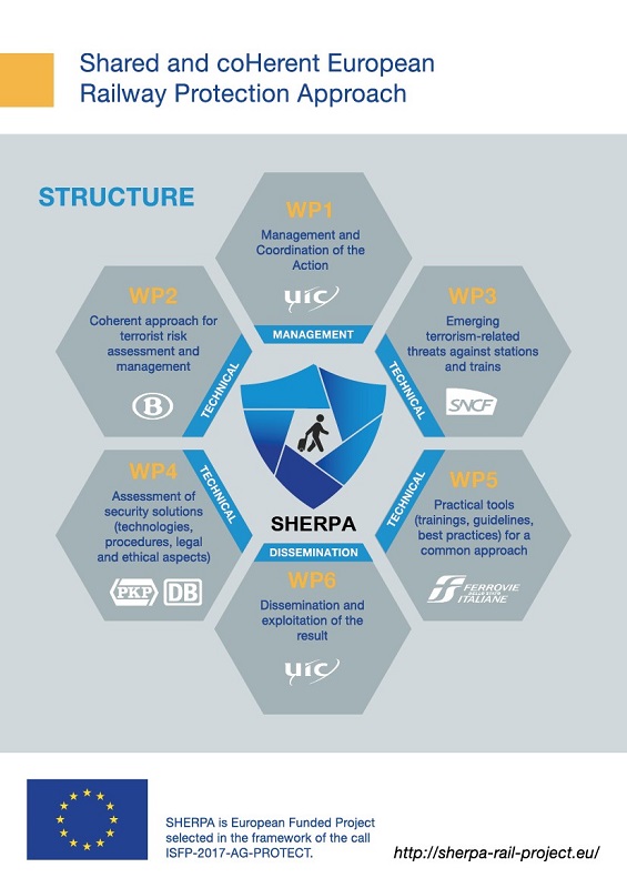 The two-year European Union SHERPA project, coordinated by UIC, began on 1 November 2018. The main objective was to improve the overall security level at railway stations and in trains (understood as public spaces and soft targets) in terms of protection against terrorism across Europe.