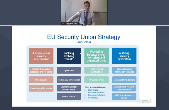 Mr Léoutre then gave an update on the EU Security Union Strategy, particulary priority areas for the period 2020 to 2025, focusing on where the EU can offer added value to support member states in fostering security for all those living in Europe. From combatting terrorism and organised crime, preventing and detecting hybrid threats, and increasing the resilience of our critical infrastructure, to promoting cybersecurity and fostering research and innovation, the strategy lays out the tools and measures to be developed over the next five years to ensure security in our physical and digital environment.