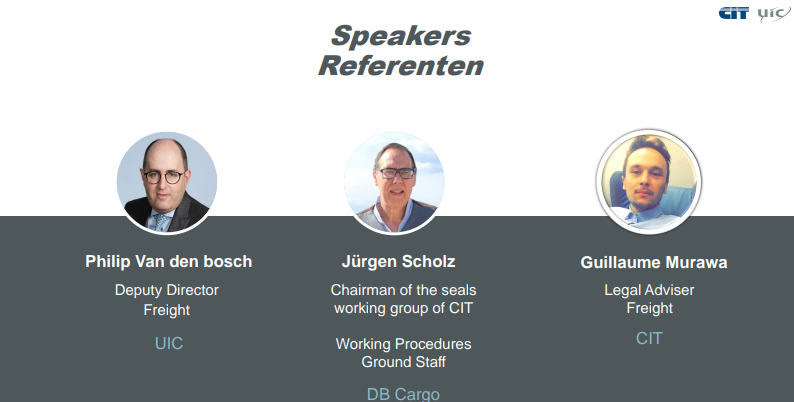 The first webinar was held on 19 November and discussed seals in rail freight transport, with the speakers being Jürgen Scholz (DB Cargo), Guillaume Murawa (the International Rail Transport Committee (CIT)), and Philip Van den bosch (UIC).