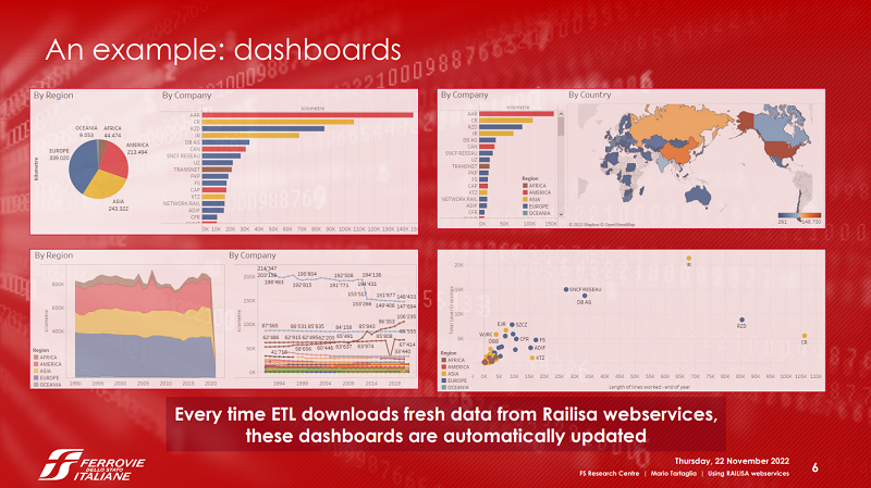Mario Tartaglia (FSI, Italy) gave a presentation on “Using Railisa webservices for data intelligence”. ETL software (Extract, Transform, Load) capable of exchanging data from/to many types of files, services, and databases is used to automate the process of downloading Railisa data into a local system and keep it up to date. Following this, different dashboards to visualise data and indicators for analysis and benchmarking were presented.