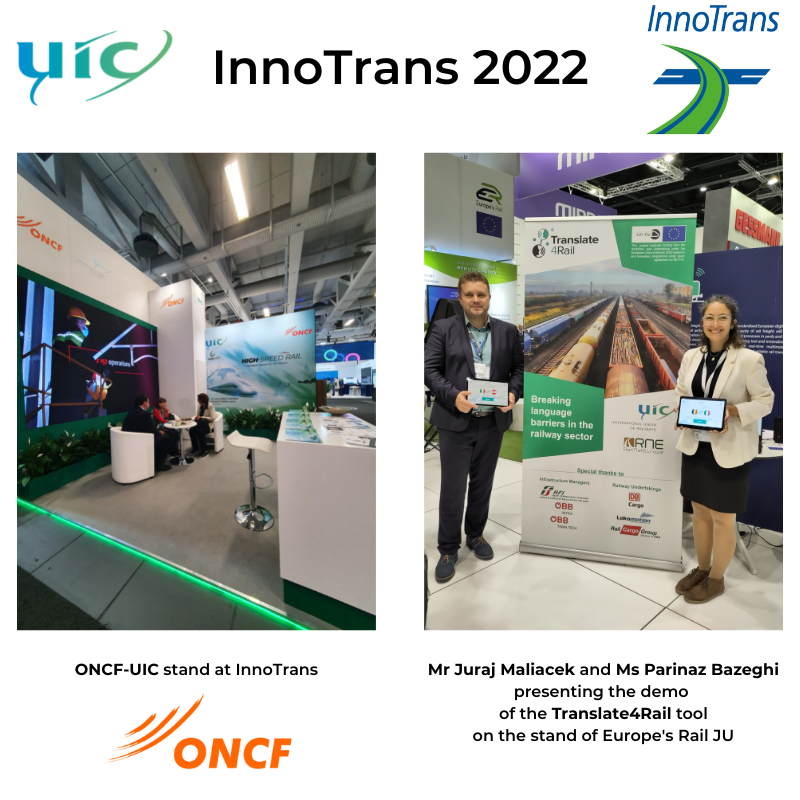 The UIC delegation used this opportunity to meet partners from international companies and colleagues from working groups based in Berlin in and out of the fair. They also showcased some of the UIC working group projects, such as 5GRail, presented on the UNIFE stand by Mr Jean-Michel Evanghelou, UIC Deputy Railway System Director. At the invitation of Europe’s Rail JU, UIC and RailNetEurope (RNE) performed on their stand a live demonstration of the automatic translation prototype tool developed in the context of the Translate4Rail project. Ms Sandra Géhénot, UIC Freight Director, and Ms Parinaz Bazeghi, Senior Freight Advisor, performed said demonstration.