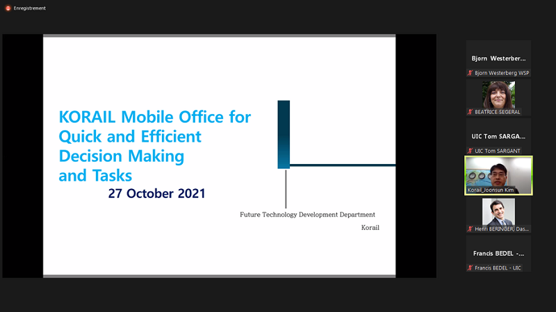 In the area of digitalisation, the participants heard from Dassault Systèmes on the use of ‘digital twins’ and how they can assist with efficient, safe and resilient train operations. This was followed by a presentation from WSP on cybersecurity and the risks faced by operators, as well as responses to such risks. The third speaker from KORAIL explained how the mobile office can be used for quick and efficient decision-making.