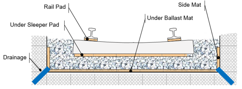 • Appendix B (State of the Art of Ballasted Track Systems). This presents a full state of the art account of the ballasted track system, track components, the evolution of different components (ballast bedding, sleepers, fastening systems and rails); design principles (geometrical, environmental, construction and operational aspects, degradation, maintenance and renewal); conceptual improvements and innovations (continuous welded rail, elasticity contact of intermediate components, under-sleeper pads, geosynthetics, bituminous sub-ballast); and track aerodynamics against ballast pick-up and life cycle cost (LCC) considerations.