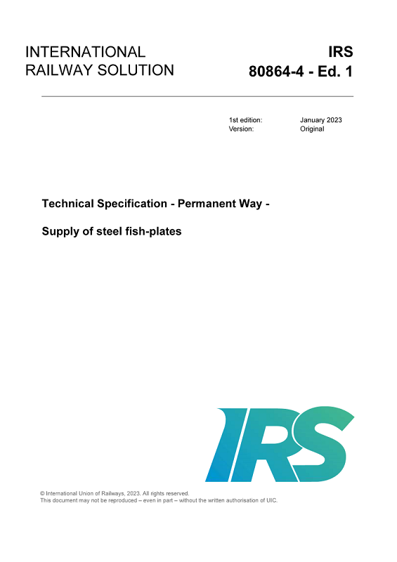 The 1st edition of IRS 80864, part 4, “Technical Specification – Permanent way – Supply of steel fish-plates” published in January 2023 is part of a second series of UIC Leaflet 864 revisions regarding track materials, as another set of complete standards or specifications does not yet exist. IRS 80864-4 has been developed as part of the Track Expert Group’s work to migrate UIC Leaflets 864-4, 6, 7 and 8 into IRSs.