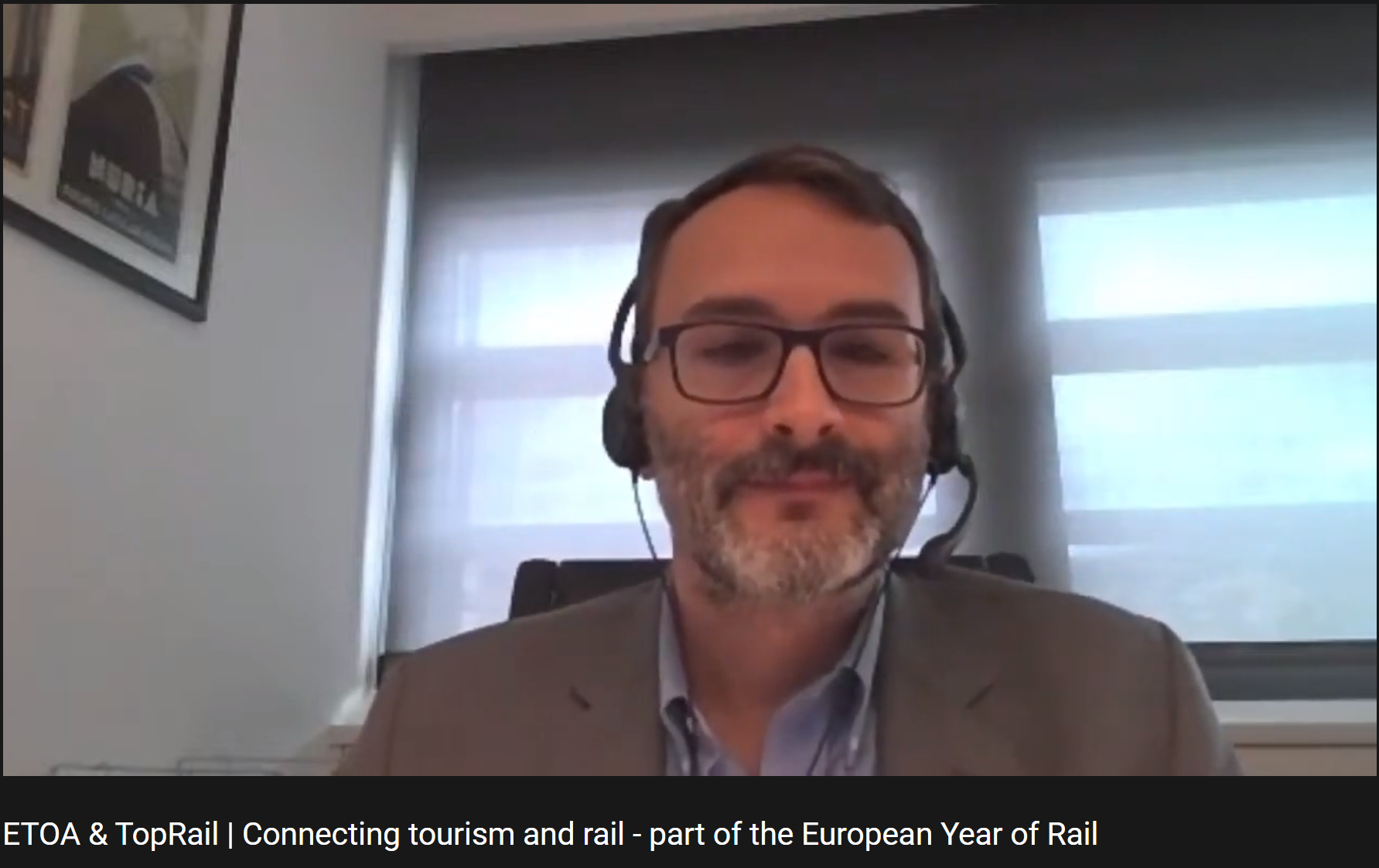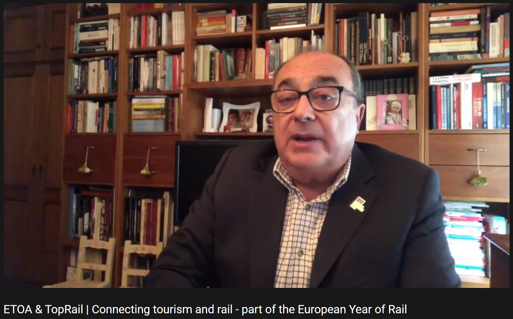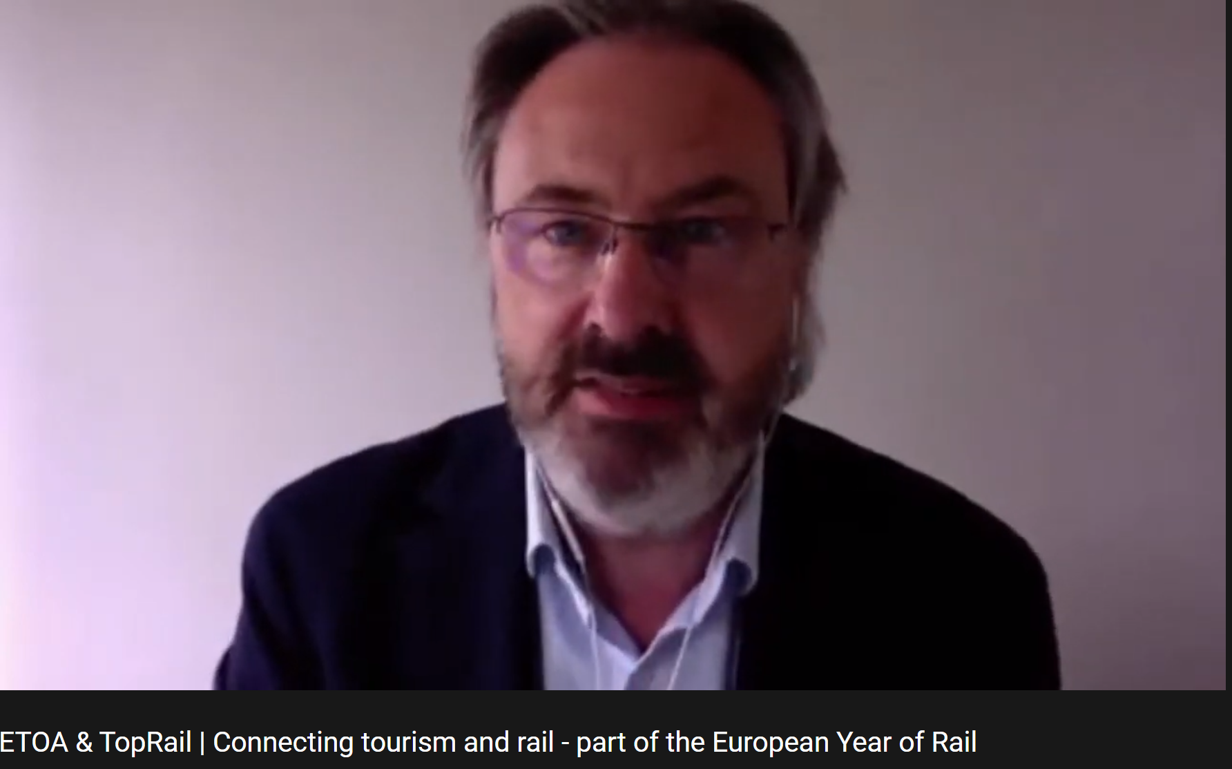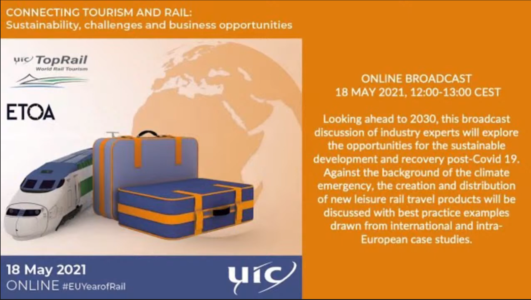 The online broadcast, held on the YouTube platform between 12:00 and 13:00, was moderated by Tim Fairhurst, Secretary General at ETOA, European Tourism Association AISBL and Carles Casas, Chairman of the UIC TopRail Group, dedicated to rail tourism. Involving a number of TopRail stakeholders across the railway community, the event looked at opportunities for sustainable development and recovery post-pandemic, the creation and distribution of new leisure rail travel products, as well as future challenges for the railways to restore customer confidence and meet the evolving travel demands of society.