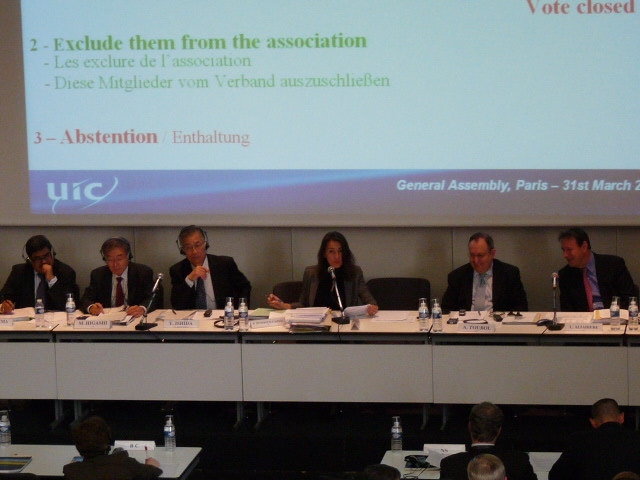 On 30 March 2009, UIC held in Paris a meeting of its Executive Board, followed on 31 March by its General Assembly. The primary objective was to approve new statutes and governance rules, and to appoint the senior management in charge of leading the “new” UIC. The General Assembly was chaired by Guillaume Pepy, President of SNCF and interim UIC Chairman (until the new Chairman Yoshio Ishida’s taking of office on 1 April), and subsequently by Ms Béatrice Dunogué-Gaffié, UIC Provisional Administrator, who had been mandated to oversee work on the revision of the statutes and finalise the proposed draft to be submitted to members.