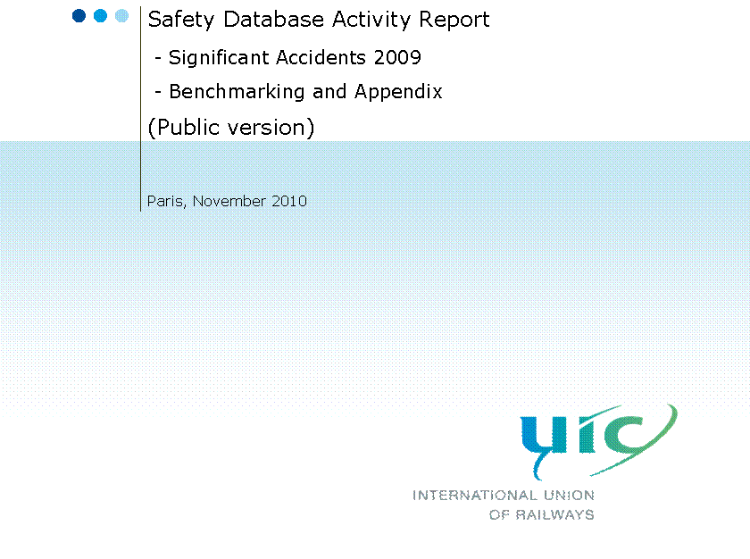 Every year a report is published presenting the data concerning railway accidents for the previous year. One version is available to the public on the UIC web site (http://safetydb.uic.org/spip.php?article2), in which all statistics appear but the names of individual railways are left out. A confidential version, available only to database members, includes the names of the railways with their data, allowing benchmarking comparisons between railways. This year’s report has been changed in some ways from previous years, with more attention given to the distinction between accidents caused internally within the railway system and externally caused accidents. The success of the European database has led to discussions about the creation of similar databases for other world regions.