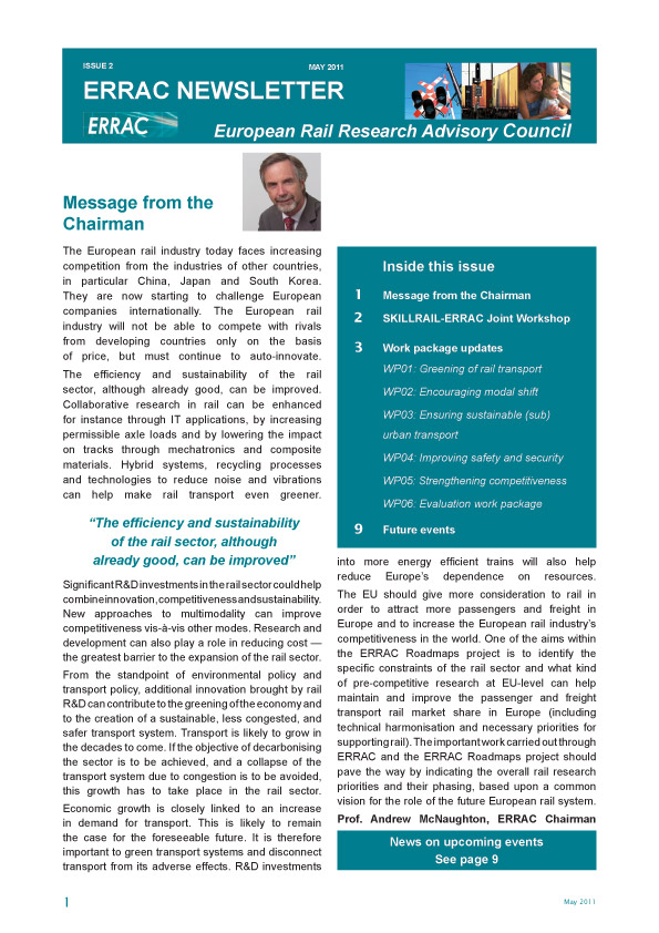 ERRAC – the European Rail Research Advisory Council – issued today in connection with its plenary meeting a new ERRAC Newsletter.