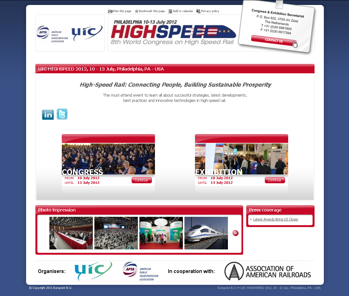 To keep you informed about the latest developments relating to the organisation of the World Congress on High Speed Rail to be held in Philadelphia from 10 to 13 July 2012, UIC eNews will give you monthly updates in this section. The website dedicated to this congress is now online. This edition is being organised by UIC and APTA in cooperation with Amtrak, FRA, AAR and VIA Rail Canada.