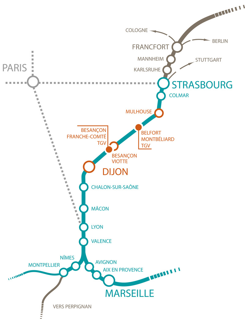 The LGV Rhin-Rhône line will also include two new stations: Besançon Franche-Comté TGV and Belfort-Montbéliard TGV, as well as the upgraded existing stations of Besançon Viotte, Dijon and Mulhouse.
