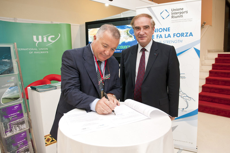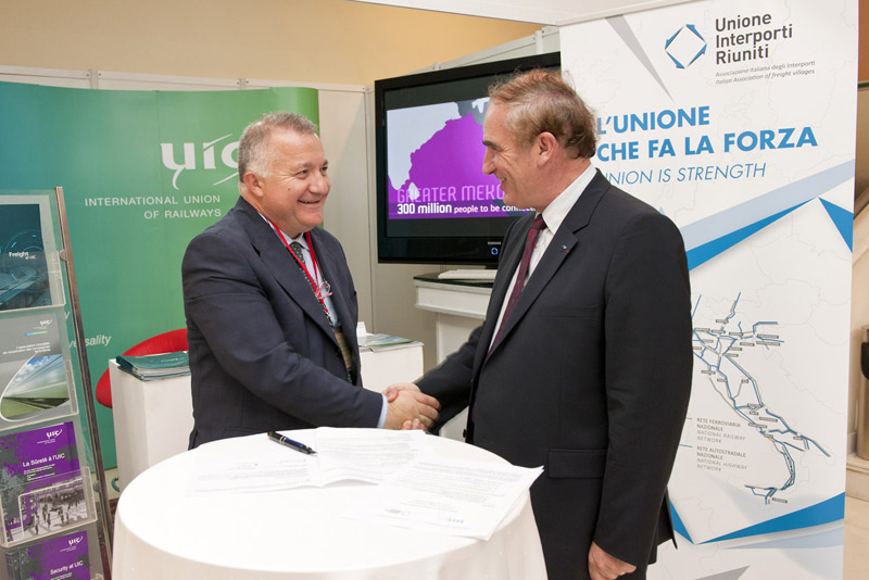 Mr Loubinoux, Director-General of UIC, and Mr Ricci, Chairman of the National Association of Italian Freight Villages (UIR), sign an MoU on cooperation during the 3rd Global Rail Freight Conference (GRFC) in Tangier.