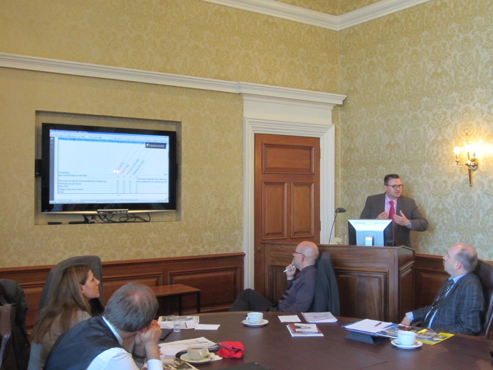 In his opening address CEO David Franks provided an overview of tourism development in Ireland and the impact of the economic crisis on the country. Thus he underlined the importance of any initiative aiming at helping to bring tourism back to pre-crisis levels and sees a good opportunity for his company to invest in this market. He was seconded by Jim Deegan, Managing Director of Railtours Ireland First Class, a tour operator, who closely works together with Iarnród Éireann Irish Rail and combines regularly scheduled train journeys with sightseeing by coach. The participants had been invited on such a tour the day before and were impressed by its perfect organisation and high standard. Jim said that he was a pioneer with the idea of shuttling tourists from Dublin to the Irish West Coast for a day tour. At that time it was only possible by using trains. However, in the booming years, Ireland invested heavily in motorways, and his business was soon facing fierce competition from many “coach only” operators. He knew he couldn’t beat them in terms of the price, so he emphasised the train journey with on-board catering as an event and ... succeeded. This proved to him and Iarnród Éireann Irish Rail that a train journey with its relatively higher comfort is a plus within a tourism package and will get its target group if it is properly marketed and organised.