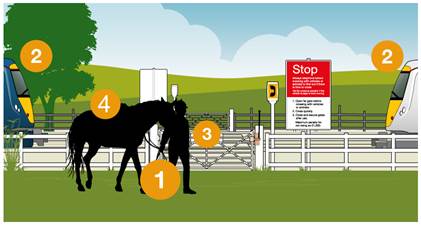 The horse riding community were identified as a key user group with specific factors relating to safe use of crossings. The section aimed at horse riders covers specific potential dangers including overhead lines and also how a horse might react to the flashing lights and alarms at a crossing.