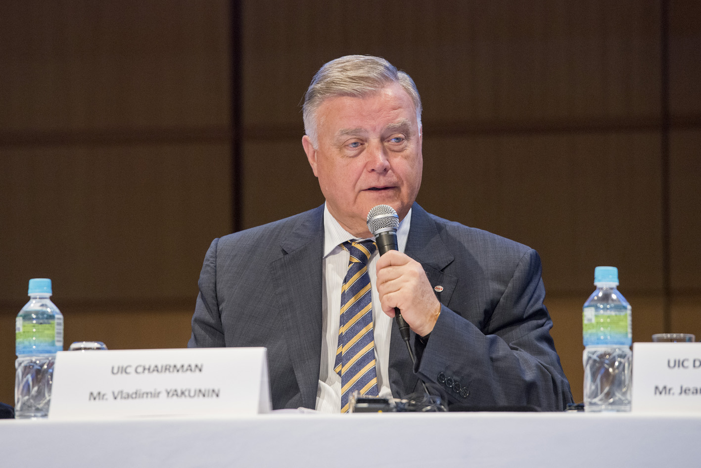 After thanking Mr Satoshi Seino and East Japan Railway for their hospitality and excellent organisation of UIC events in Japan, Chairman Vladimir Yakunin reported in his introduction on the main achievements and challenges for UIC in the current period. He first mentioned the growing positioning of UIC vis-à-vis United Nations and various bodies. An important development is the role ensured through the presence of the UIC General Director at the High Level Advisory Group on Sustainable Transport to the Secretary General to represent the voice of the railways.