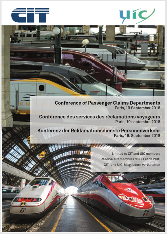 The CIT and UIC have great pleasure in inviting the staff of claims, sales and legal departments of their members to this year’s Conference of Passenger Claims Departments to be held at UIC Headquarters in Paris on Wednesday, 19 September 2018. The conference will offer both interesting presentations as well as workshops on current topics.