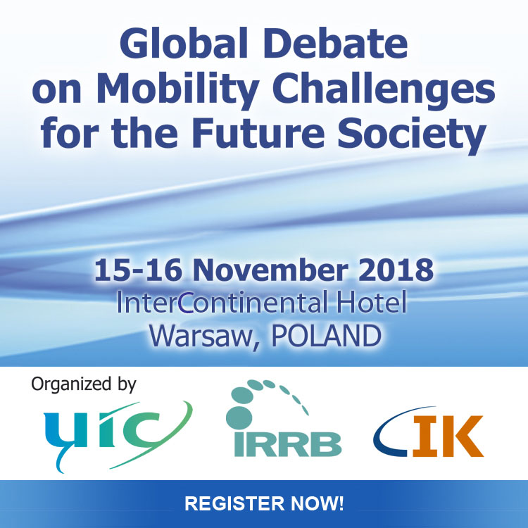 The UIC International Rail Research Board (IRRB) and Instytut Kolejnictwa – the Polish Railway Research Institute (IK) are jointly organising an international event entitled “Global Debate on Mobility Challenges for Future Society” to be held from 15 – 16 November 2018, at the Intercontinental Hotel, Warsaw City Centre, Poland.