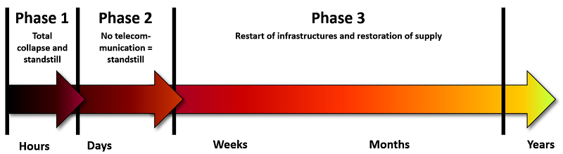 The typical development of a blackout may be divided into three major phases (see picture below). Due to the lack of experience in Europe, it is very difficult to forecast how long it would take to restore and stabilise the European power supply. The estimated timeframe from experts differs from many hours up to several days for different regions.