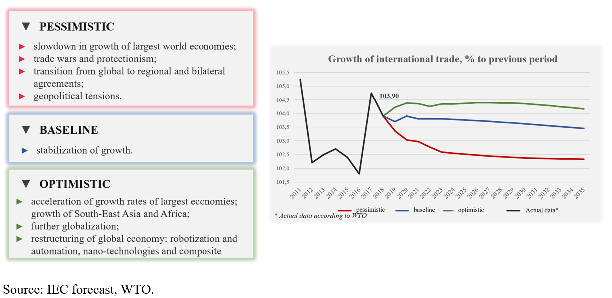 Three macroeconomic scenarios were considered for the study: pessimistic (supposing trade wars, health crisis, geopolitical tensions), baseline (supposing stabilisation of growth) and optimistic (supposing acceleration of growth rates of largest economies and further globalisation). The modelling is based on the baseline scenario.