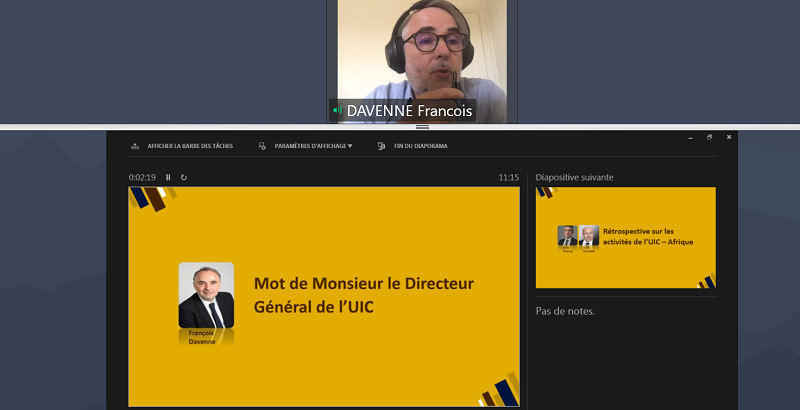François Davenne, UIC Director General, welcomed participants to the training session. He emphasised that UIC remained open and active during the pandemic, maintaining all its meetings and platforms, thanks to the organised efforts and work of the staff; and strengthening the role it plays for the UIC members. He noted the importance of the African region in the UIC strategy which will be deployed in the near future. Mr Davenne further mentioned that it would be the first time that the two-week training session organised by ONCF and UIC was taking place via web-conference.