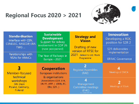 EMC also approved the topics on which the region will focus for the rest of this year and into the next, including the necessary links between the EU Green Deal and the operational railway, the development of version 3 of the Railway Technical Strategy Europe (2021) and the development of the framework for the successor to the current Shift2Rail.